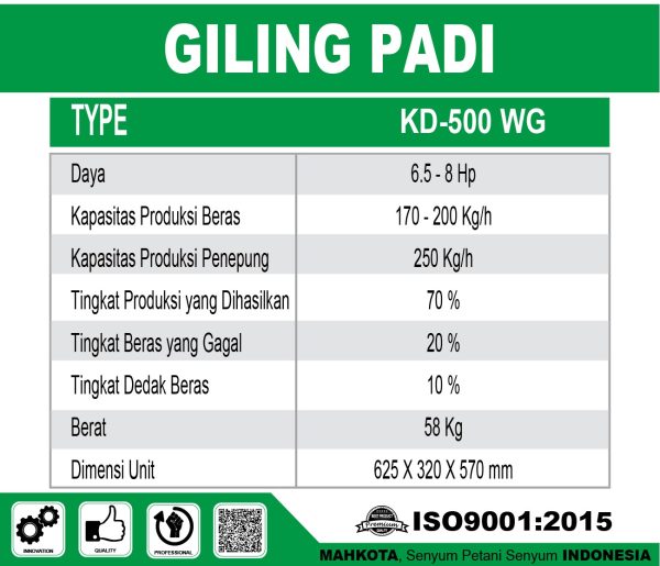 | Kapasitas Produksi Beras | 170 – 200 Kg/h |